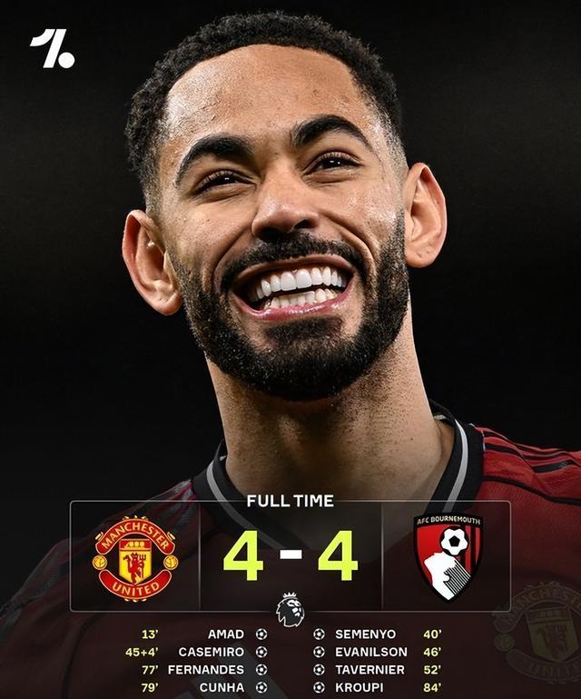 全场战罢,曼联主场4-4上演进球大战收获平局,近5次对阵伯恩茅斯3平2负难求一胜,B费传射当选MVP。假如门前站着的是奥纳纳,这场比赛很可能是变成曼联领先过3次,但最后被对手绝杀的尴尬剧情……