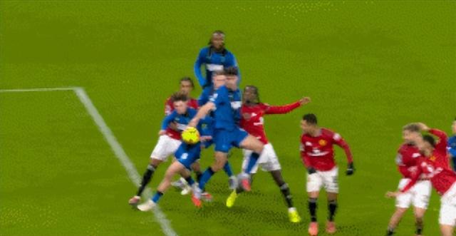 不只是曼联的后防线,本场的主裁判西蒙-胡珀,同样是抽象比赛的重要参与者。无论是开场2分钟,B费射门反弹击中对方球员手部,还是第25分钟对方球员争顶时疑似手球,上半场补时对方球员有疑似手球,主裁判均不认为有啥问题!