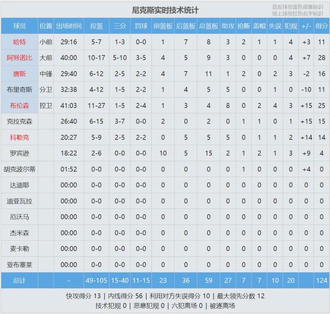 阿努诺比10投8中,半场狂砍20分!布伦森15投6中拿到15+2+4,唐斯7中3拿到9+7+1。文班半场6中2仅得4分4板,瓦塞尔12分、福克斯9分8助、卡斯尔6分7助。唐斯第三节重新登场,福克斯连中两记三分,马刺下半场6-0开局。