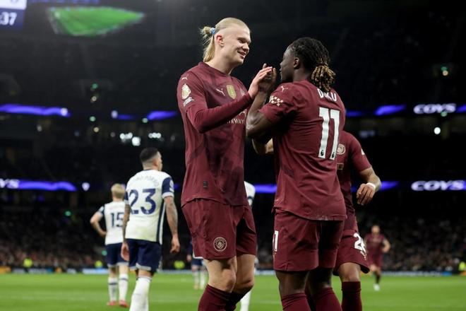 不过有一说一,本赛季的曼城与之前拿到欧洲三冠王和英超4连冠的那支冠军之师相比,还是有很大的差距。在送走了德布劳内、京多安、阿坎吉和凯尔沃克等功勋老将、中场真核罗德里也饱受伤病困扰本赛季出场寥寥的情况下,曼城在英超赛场上的统治力已经不复存在,瓜迪奥拉甚至无法很好贯彻他的传控战术理念。如今的曼城,只能依靠一套低位传控加快速反击的战术在英超立足。进球看哈兰德,防守看多纳鲁马,一前一后两大神人扛起球队,一个拼命让对手球门失守,一个则面对对方前锋和本方后卫的联合挖坑希望能够拿到零封奖。但还真别说,这套战术还真的很管用。当然,缺陷也很明显。哈兰德是本赛季英超乃至欧洲五大联赛最为火爆的前锋之一,23场各项比赛打进了25球并送出4次助攻,英超联赛则是17场19球4助攻。不过除了他之外,曼城进球上双的球员就只剩下太子菲尔福登,而且是不多不少正好10粒进球。此外,曼城进攻中的爆点型球员,也只有比利时边锋多库。所以,虽然曼城在17轮英超联赛中打进了足足41粒进球,比榜首的阿森纳多了10粒。但他们的锋线其实隐患很大,一旦哈兰德或者多库出现问题,进攻就开始玩不转。
