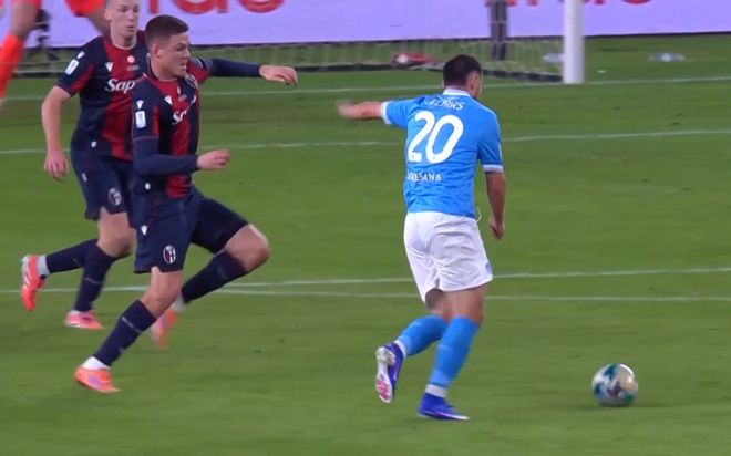 那不勒斯是上个赛季意甲冠军,博洛尼亚则是意大利杯冠军,两队这次超级杯半决赛分别击败了上个赛季的意大利杯亚军AC米兰和意甲亚军国米。开场后两队也是势均力敌展开对攻,第5分钟,博洛尼亚左路快速反击,坎比亚吉突入禁区抢点时被回防的波利塔诺和拉赫马尼包夹,争抢中坎比亚吉摔倒,主裁没有吹罚点球。第10分钟,那不勒斯左路快速反击,曼联旧将麦克托米奈带球斜切至中路精妙斜塞左侧,埃尔马斯跟进突入禁区接球获得单刀良机,只是他没有把握住机会,超近距离推射竟然是打偏了。