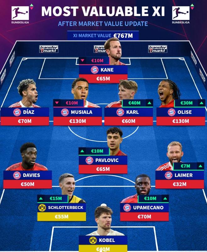 德转更新后德甲最贵11人阵容:门将科贝尔(多特蒙德)4000万欧元后卫莱默尔(拜仁慕尼黑)3200万欧元(+700万)、于帕梅卡诺(拜仁慕尼黑)7000万欧元(+1000万)、施洛特贝克(多特蒙德)5500万欧元(+1500万)、阿方索-戴维斯(拜仁慕尼黑)5000万欧元中场亚历山大-帕夫洛维奇(拜仁慕尼黑)6500万欧元(+1000万)、奥利塞(拜仁慕尼黑)3200万欧元(+700万)、伦纳特-卡尔(拜仁慕尼黑)6000万欧元(+4000万)、穆西亚拉(拜仁慕尼黑)1.3亿欧元(-1000万)、路易斯-迪亚斯(拜仁慕尼黑)7000万欧元前锋哈里-凯恩(拜仁慕尼黑)6500万欧元相关资讯