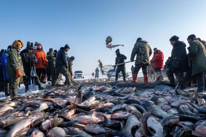 2024年1月23日,吉林查干湖:千米大网合围鱼群,古老而壮观的冬捕活动。图/IC photo