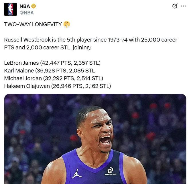 除此之外,威少在本场比赛之后也成为NBA历史上第二位能够拿到至少25000分2000次抢断的后卫球员,第一人是篮球之神乔丹。哪怕不对球场位置设限制,NBA历史上也仅有5人做到这一壮举,分别是威少、大梦、乔丹、马龙和詹姆斯。