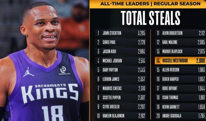 一战迎两大里程碑凭借这样的表现,威少一战迎来两大里程碑,首先是抢断总数突破2000大关,成为NBA历史上第14位完成这一壮举的球员。