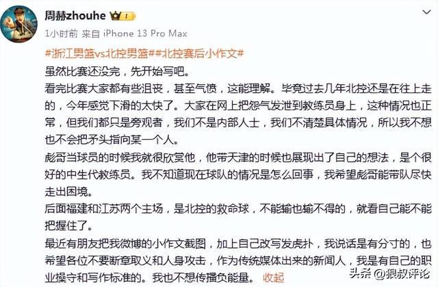 媒体人周赫发文点评:看完比赛大家都有些沮丧,甚至气愤,这能理解。毕竟过去几年北控还是在往上走的,今年感觉下滑的太快了。大家在网上把怨气发泄到教练员身上,这种情况也正常,但我们都只是旁观者,我们不是内部人士,我们不清楚具体情况,所以我不想也不会把矛头指向某一个人。