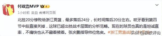 媒体人付政浩发文:北控20分惨败给浙江男篮,最多落后24分,长时间落后20分左右。咬牙看到第四节中段直接关掉,这球已超出技战术层面的分析范畴。现在的球员也真的是坦诚直率,不痛快也从不藏着掖着。张庆鹏指导帅位危矣。