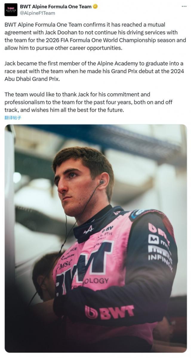 Alpine车队官方消息,杰克·杜汉离开车队,以追求其他职业机会。Alpine车队官方写道:Alpine车队确认已与杜汉达成共识,杜汉将不再为车队效力参加2026年F1赛事,以便他能够追求其他职业机会。杜汉是首位从Alpine学院毕业并获得车队正式车手席位的成员,他在2024年阿布扎比大奖赛上首次亮相。车队感谢杜汉过去四年里在场上以及场下对车队的付出和敬业精神,并祝愿他未来一切顺利。杜汉2025年初担任Alpine车队正式车手,但在迈阿密大奖赛之后,他的席位被科拉平托取代。