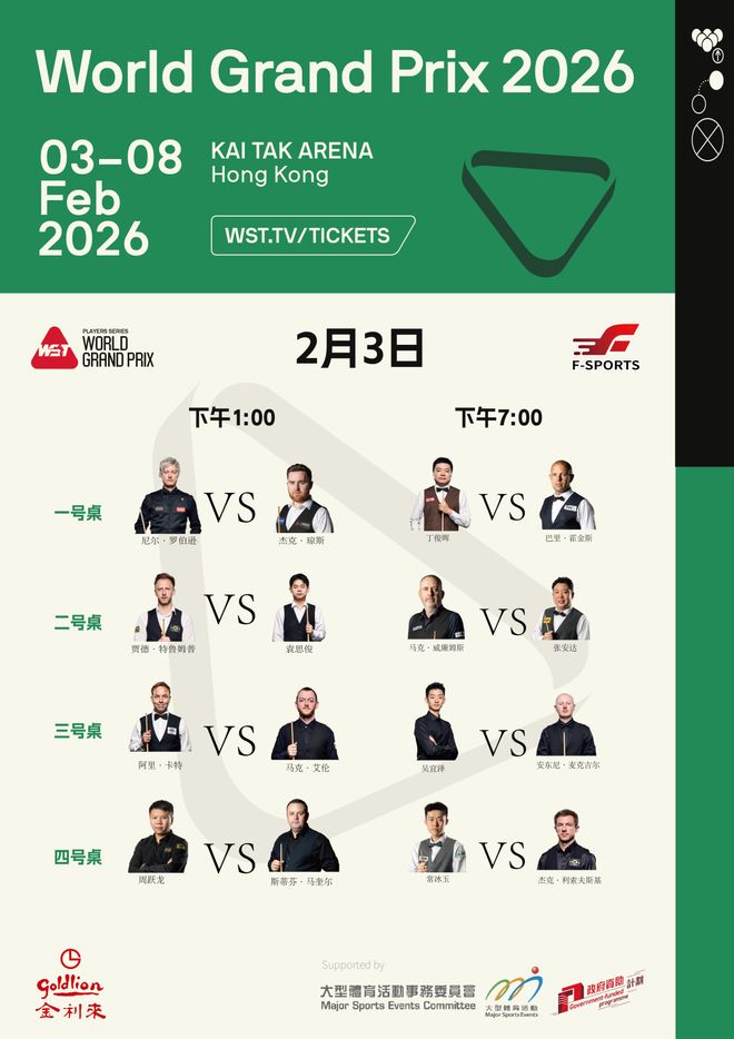 敬请关注“2026斯诺克世界大奖赛”官方赛事信息,获取最新动态与购票信息。
