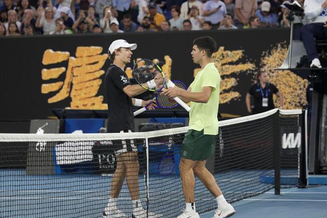 阿尔卡拉斯(右)在表演赛中战胜德米纳尔。