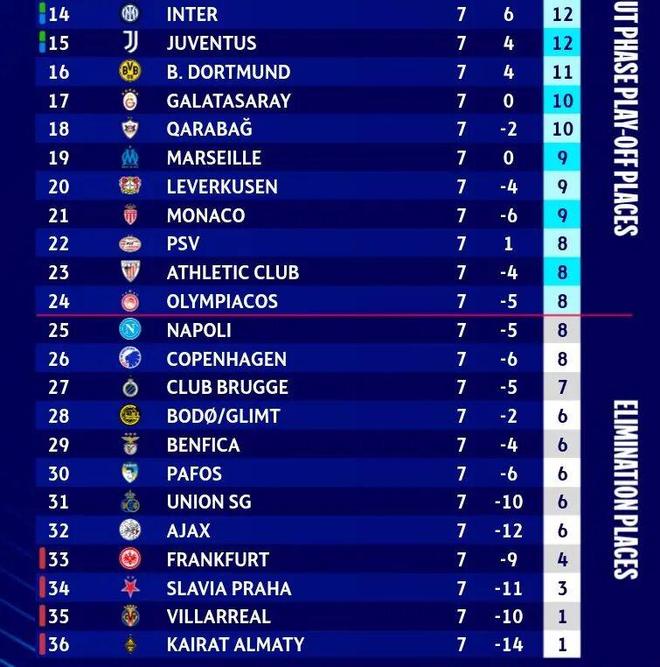 阿贾克斯(第32积6分)只有理论上的希望,荷甲豪门必须大胜奥林匹亚科斯(第24),还得指望前面至少七到八支球队全部输球,才有可能奇迹般地挤进前24。
