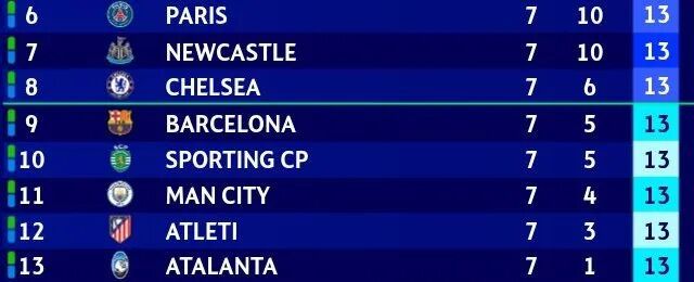 这是竞争最激烈的地方。从第3名的皇家马德里到第13名的亚特兰大,各支球队之间的分差仅在2分以内。